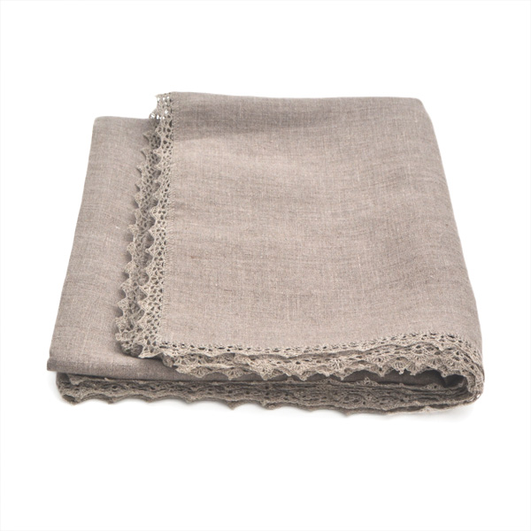 Hørdug i naturfarve med håndhæklet kant. Meget smukt dug med fin håndhæklet kant i tynd hørgarn.